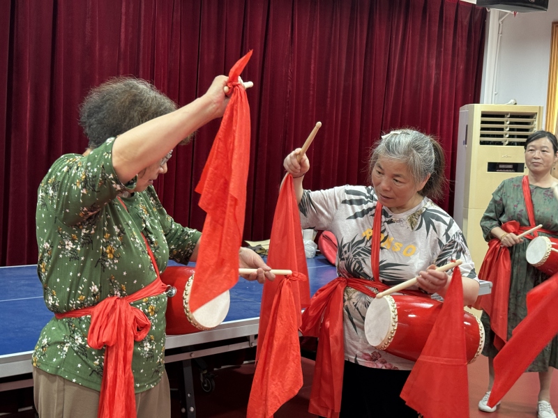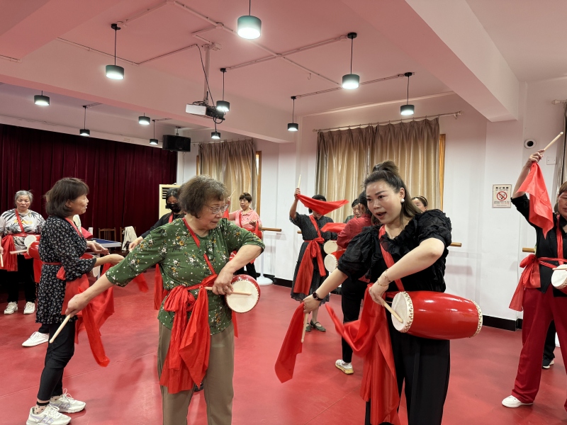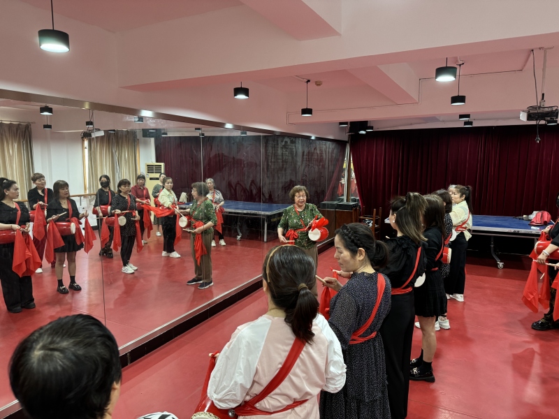 活动中,老师讲解鼓棒拿法、腰鼓步伐、鼓点的击打等技巧,分解示范动作要领,传授学习腰鼓的经验,提醒大家在表演时动作要舒展,展现出自己的精神面貌,学员们热情高涨,系上火红的腰鼓,排着整齐的队形,精神气十足,在老师的带领下,大家逐渐掌握了腰鼓的演奏技巧,伴随着欢快的鼓点,现场气氛越来越热烈。