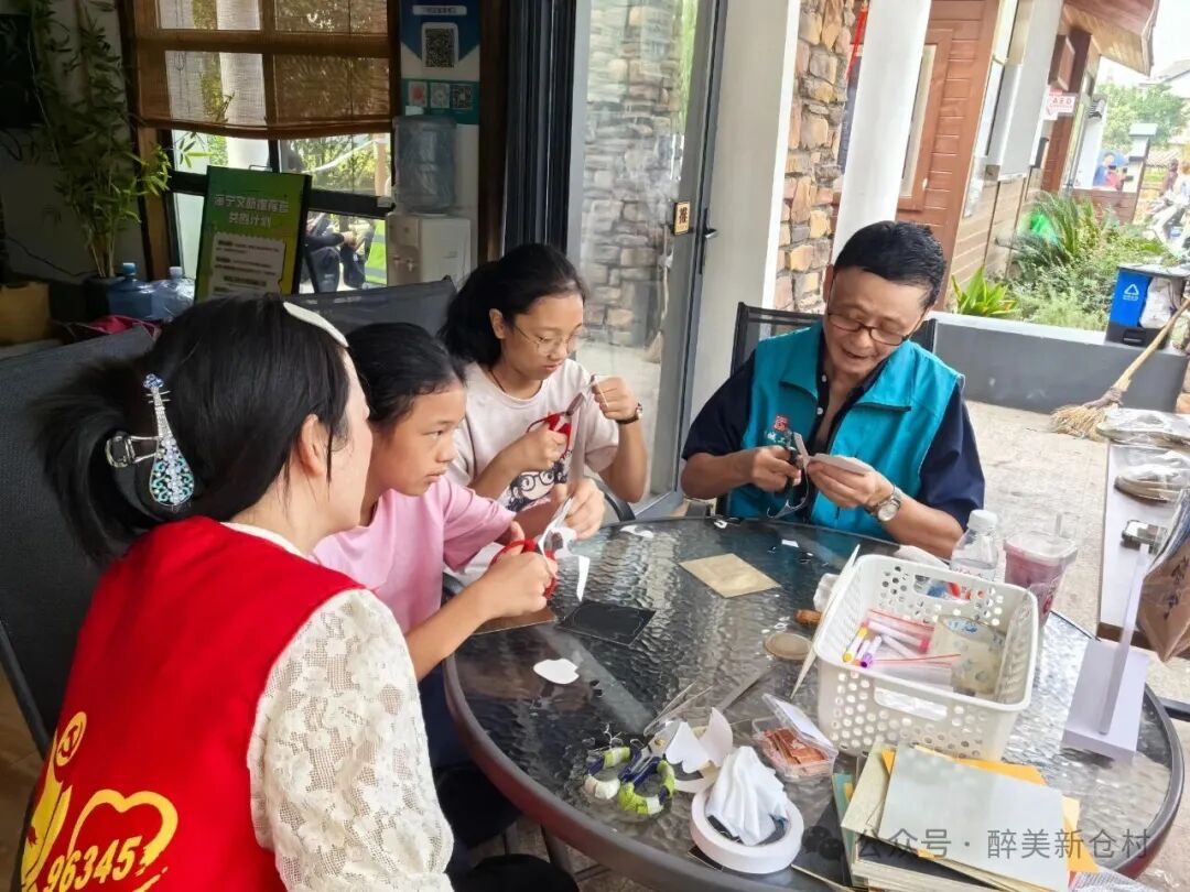为让非遗可触、可感、可带走,国庆长假期间,新仓村在梁家墩景区特别设置了互动体验区。非遗皮贴画代表性传承人徐荣老师现场指导,吸引了大量亲子家庭和年轻游客。游客们纷纷停下脚步欣赏冰箱贴、扇子、包包等皮贴画衍生文创产品。徐荣老师更是现场演示了皮贴画从设计、剪裁到粘贴的全过程,开设了互动教学课堂,带领游客们,尤其是亲子家庭,亲手制作大熊猫主题的皮贴画作品。