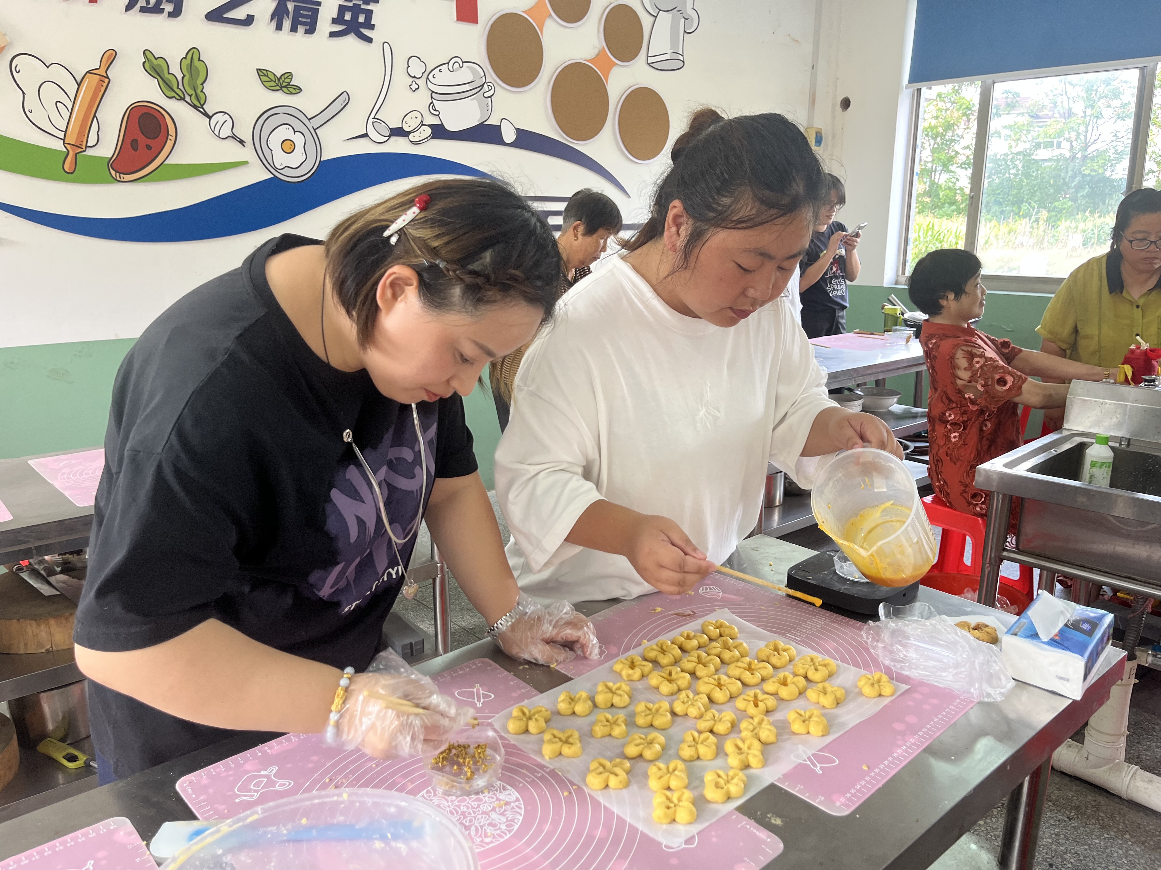 此次培训活动特邀请了有丰富实操经验的烘焙达人潘园菲授课。在授课过程中潘老师采取了理论与实践操作相结合的教学方式,内容全面覆盖了戚风蛋糕坯的制作方法、奶油打发与抹面的基本技巧以及桂花桃酥的制作方法等。此外,潘老师就烘焙中的常见问题和大家分享了解决方案。在老师指导下,学员们开始尝试奶油蛋糕和桃酥的制作。学员们学得非常认真,刚开始时,部分学员动作略显生疏,但在反复练习后逐渐掌握了技巧,动作越来越娴熟。现场气氛热烈,学员们互相交流心得,分享制作经验。