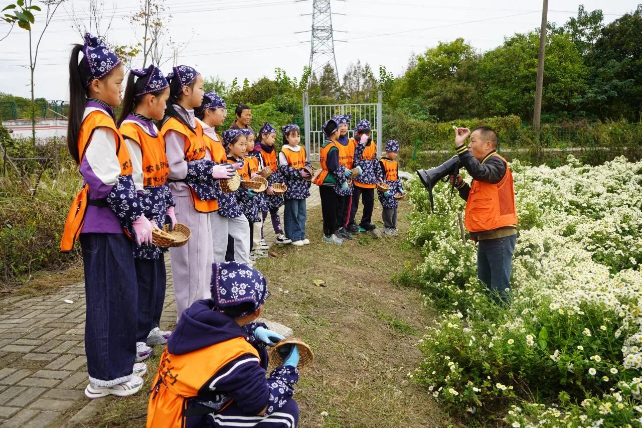 科普讲解结束后,亲子家庭手持小竹篮,走进农庄的野菊种植区,开启了采摘之旅。“妈妈,你看这朵杭白菊的花瓣好白,花瓣层层叠叠的,是不是就该摘这样的?”“教官说要摘完全开放的花朵,这样香气更浓!” 孩子们在家长的陪伴下,小心翼翼地挑选着符合要求的野菊花,一边采摘一边交流着刚刚学到的知识。家长们耐心引导孩子观察花朵的形态,手把手教他们正确的采摘方法,避免损伤植株。田间地头,大人与孩子的笑声、讨论声交织在一起,构成了一幅温馨的亲子研学画卷。