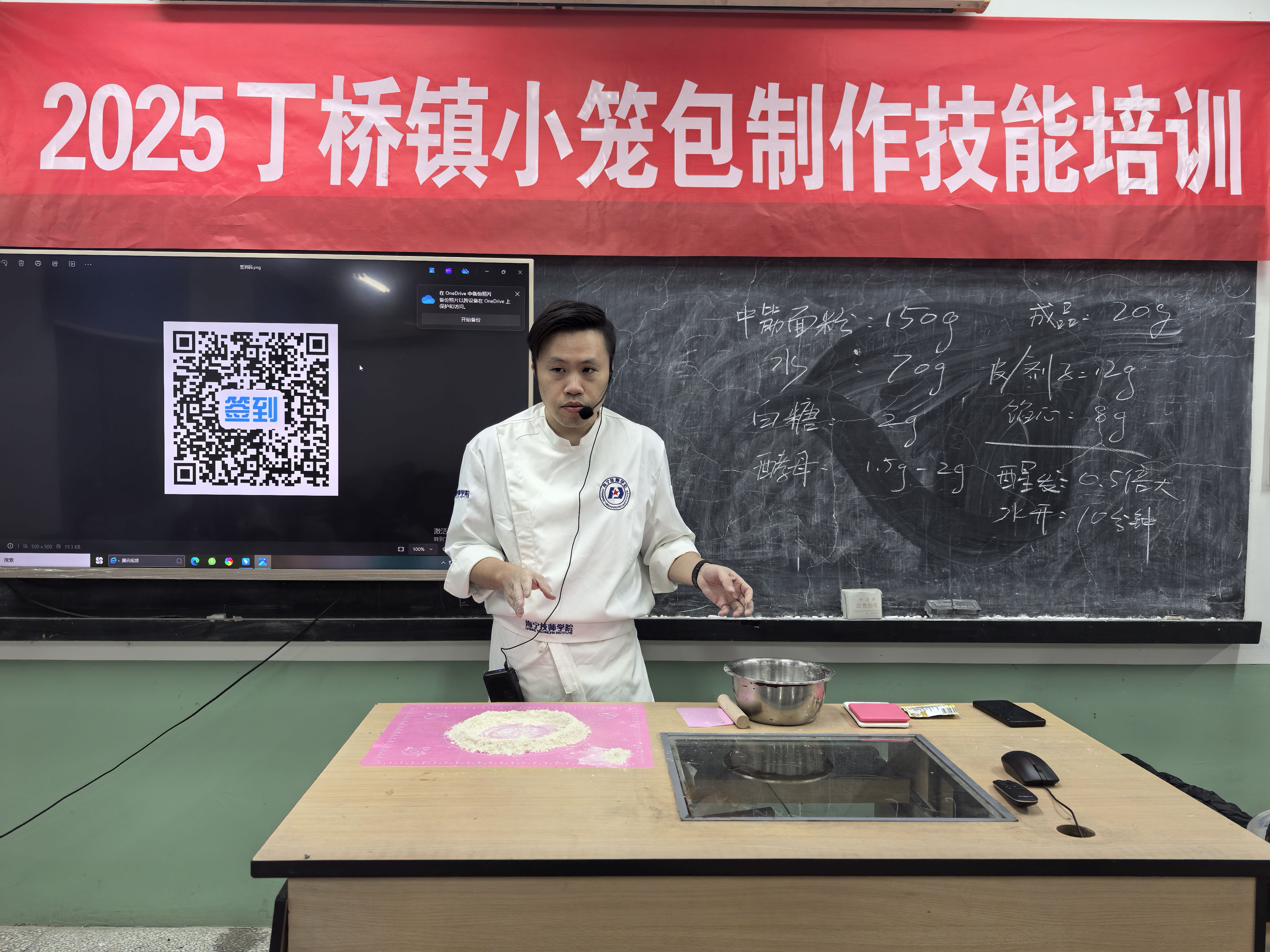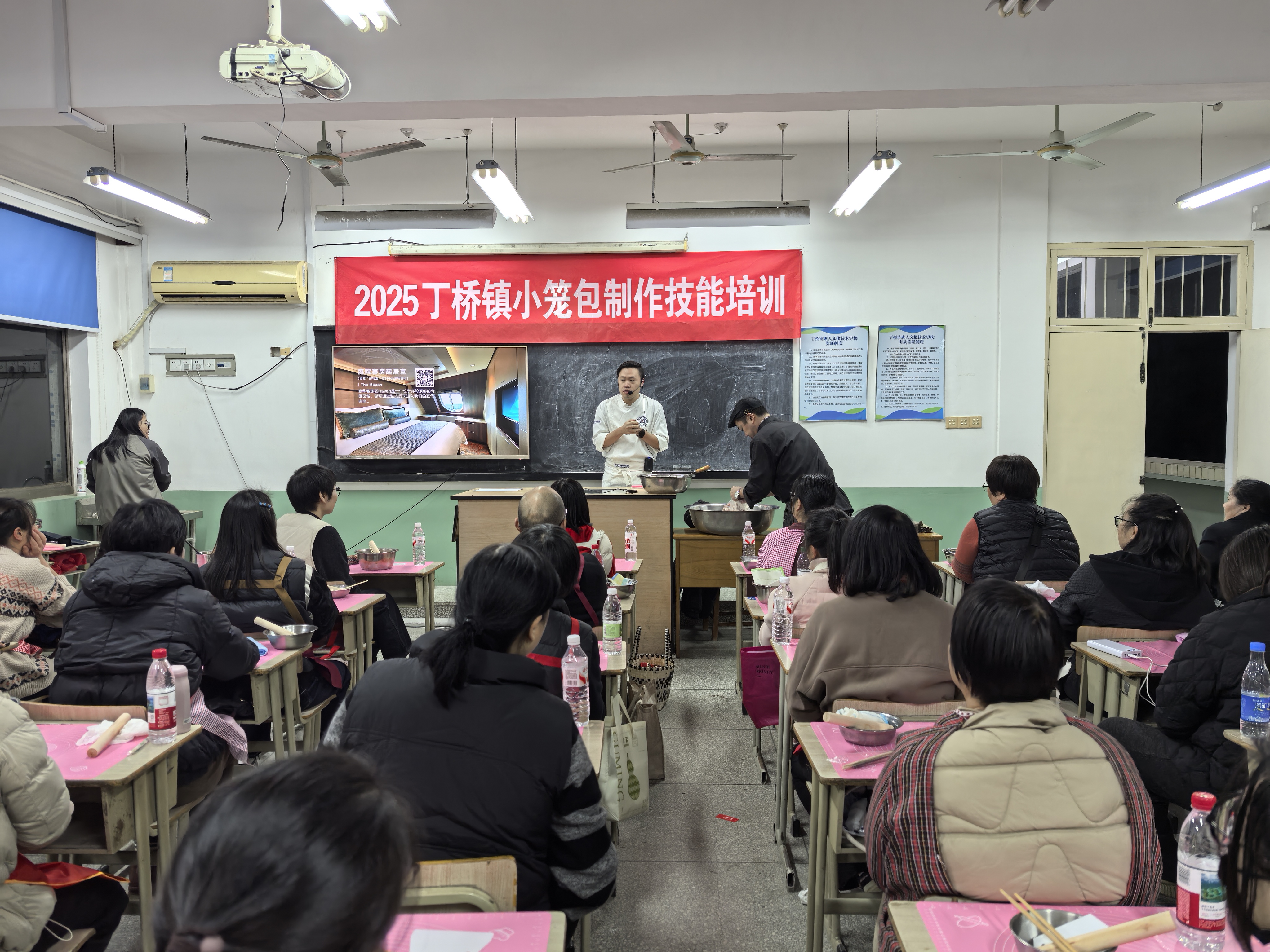 为弘扬地方饮食文化,提升居民就业创业能力,11月20日晚,丁桥镇小笼包制作技能培训在镇社区教育中心开班,吸引辖区内40名美食爱好者及有创业意向的居民报名参与。本次培训以“传承舌尖技艺,赋能美好生活”为主题,通过系统化课程,帮助学员掌握小笼包传统制作工艺,为就业创业增添新技能。