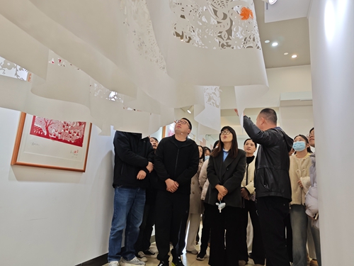 表彰结束后,蒋校长带领大家参观了硖石成校剪纸培训成果展。现场陈列着硖石成校2025年剪纸培训班学员创作的剪纸及剪纸文创作品,一件件精美的作品令大家赞叹不已。
