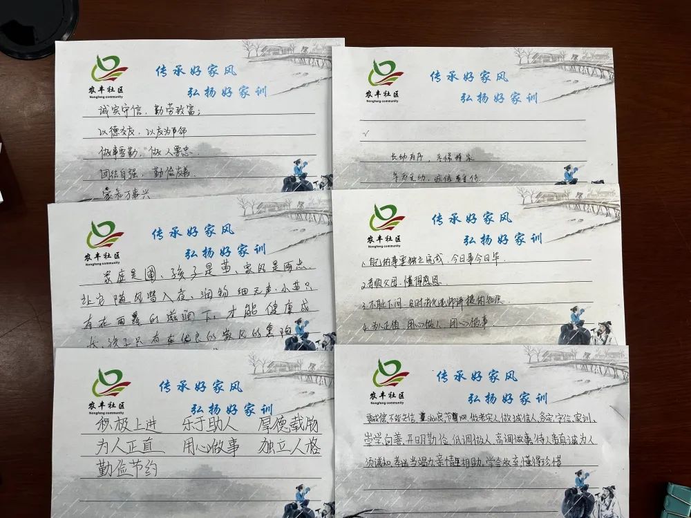 随后,工作人员给大家发放家风家训征集卡,引导家长带领孩子用手写的方式秀出好家风。“为人正直,用心做人,用心做事。”一条条家风家训,承载着一个个家族思想的延续。家风连国风,国风兴家风,让好家风、好家训蕴含的优良传统,传进更多居民家中。