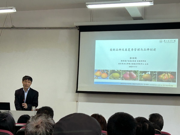 本次培训采用室内培训结合田间讲解示范。室内邀请了国家现代农业(梨)产业技术体系首席科学家、南京农业大学教授张绍铃就“梨新品种及春夏季管理与品牌建设”进行讲解。培训中既有图文演示,也有实地答疑,专家导师对梨生产管理技术进行了深入浅出的讲授,让参与培训人员进一步了解梨产业现状及发展思路,掌握实用的果树生产技术,更加直观地理解和掌握涉及的知识内容与农技方法。室外针对当地梨树花后筛果、树体结构调整和水晶梨授粉品种搭配等环节存在的问题,在仓桥水晶梨专业合作社梨园进行了筛果示范培训,现场解答了梨农生产中遇到的技术问题。