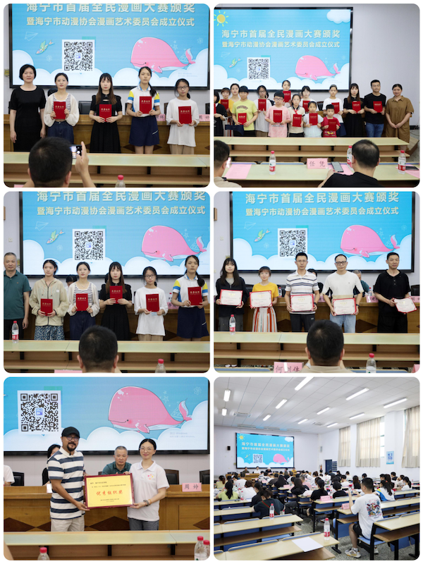 在颁奖典礼上,海宁市社区学院李忠华老师宣读了海宁市首届全民漫画大赛获奖文件及嘉兴、省级获奖名单。浙江开放大学海宁学院周婷副院长为海宁市一、二等奖获奖代表颁奖,海宁市文联李建祥副主席为嘉兴市获奖代表颁奖,海宁市教育局党委委员、总督学金新宇为省级获奖代表颁奖,海宁市招商服务中心许佳婧副主任颁发海宁市优秀组织奖,浙江省漫画家协会副主席邹强为嘉兴市优秀组织奖颁发了铜牌。