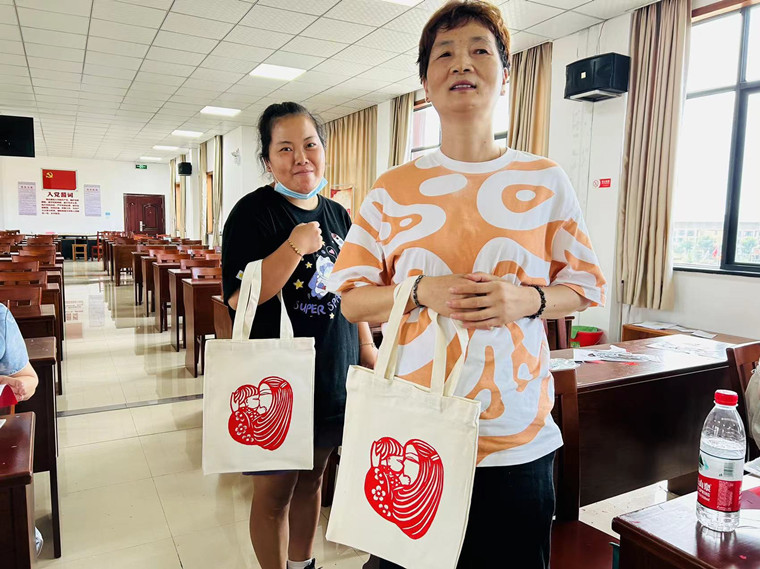 在她的带领下,姐妹们开始动手制作属于自己的帆布袋。根据剪纸小口诀“从里到外、先细后粗、从上到下、从左到右”,大家按照先镂空、后剪边的程序,陆续完成了剪纸。最后,顺利地将作品转印在帆布袋上,一个个结合传统非遗和时尚环保的帆布袋就诞生了。