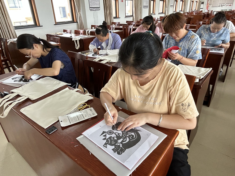 8月8日,斜桥镇成校在斜桥村妇联共富工坊共同举办的共富姐妹课堂开课啦!本次剪纸活动共吸引二十余人参加。
