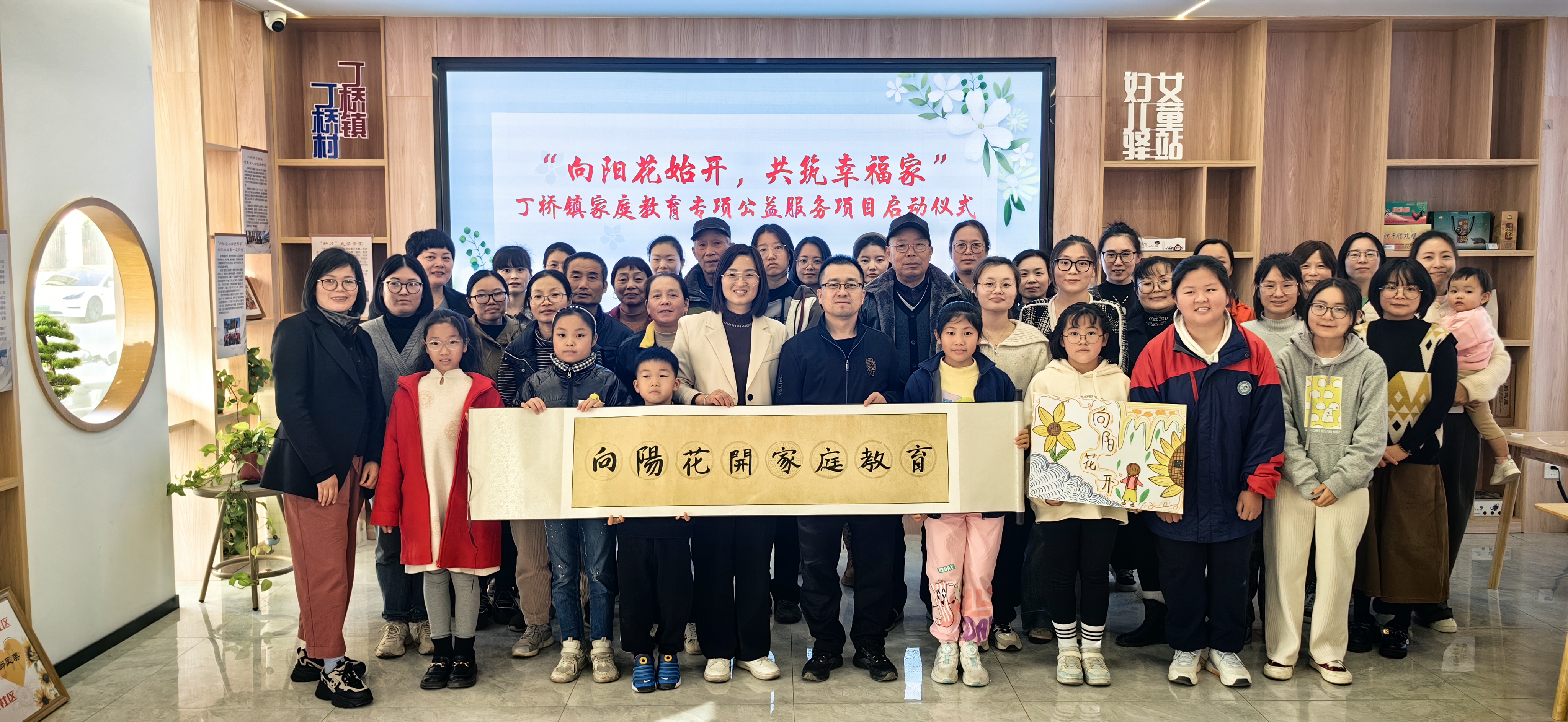 在世界儿童日到来之际,11月18日下午,丁桥镇在镇妇儿驿站开展了以“向阳花始开,共筑幸福家”为主题的家庭教育专项服务启动仪式。丁桥镇妇联主席顾权、丁桥镇成校校长顾永利、各村社妇联主席、本土讲师团成员和辖区内亲子家庭50多人参加活动。